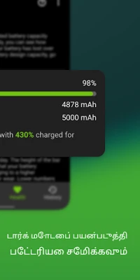 உங்கள் பேட்டரியின் உண்மையானத் திறன் (mAh), ஒவ்வொரு சார்ஜ் சுழற்சியிலும் ஏற்படும் தேய்மானம், சார்ஜ் குறையும் வேகம், ஆழ்ந்த தூக்க நிலை சதவீதம் மற்றும் திரைக்குப் பின்னாலும், திரையுடன் பயன்படுத்தும்போதும் பேட்டரி செலவாகும் விதம் போன்ற முக்கியத் தகவல்களை நிகழ்நேரத்தில் **AccuBattery** வழங்குகிறது. பேட்டரியின் ஆயுளை நீட்டிக்க இருண்ட மற்றும் AMOLED தீம்கள், முந்தைய நாள் பயன்பாட்டு விவரங்களை அணுகும் வசதி, அறிவிப்புகளில் விரிவான புள்ளிவிவரங்கள் மற்றும் விளம்பரங்கள் இல்லாத அனுபவம் போன்ற சிறப்பு அம்சங்களும் இதில் அடங்கும். நாங்கள் ஒரு சிறிய, தனிப்பட்ட ஆப்ஸ் டெவலப்பர் குழுவாக, துல்லியமான மற்றும் பயனுள்ள பேட்டரி புள்ளிவிவரங்களை வழங்குவதில் ஆர்வம் கொண்டுள்ளோம். **AccuBattery** எந்தவித தனிப்பட்ட தகவல்களையும் அணுகாது, தவறான வாக்குறுதிகளையும் ஒருபோதும் வழங்காது. எங்கள் முயற்சி உங்களுக்குப் பிடித்திருந்தால், Pro பதிப்பிற்கு மேம்படுத்துவதன் மூலம் எங்களுக்கு ஆதரவளிக்கலாம்.
